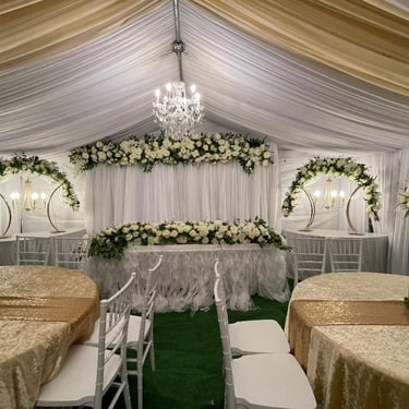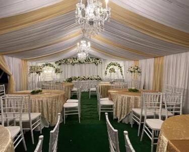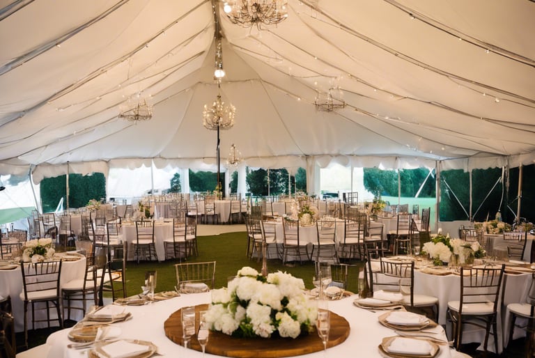 Theme and decor: Select a tent style and accessories that complement your wedding theme and color scheme, creating a cohesive and visually appealing atmosphere.